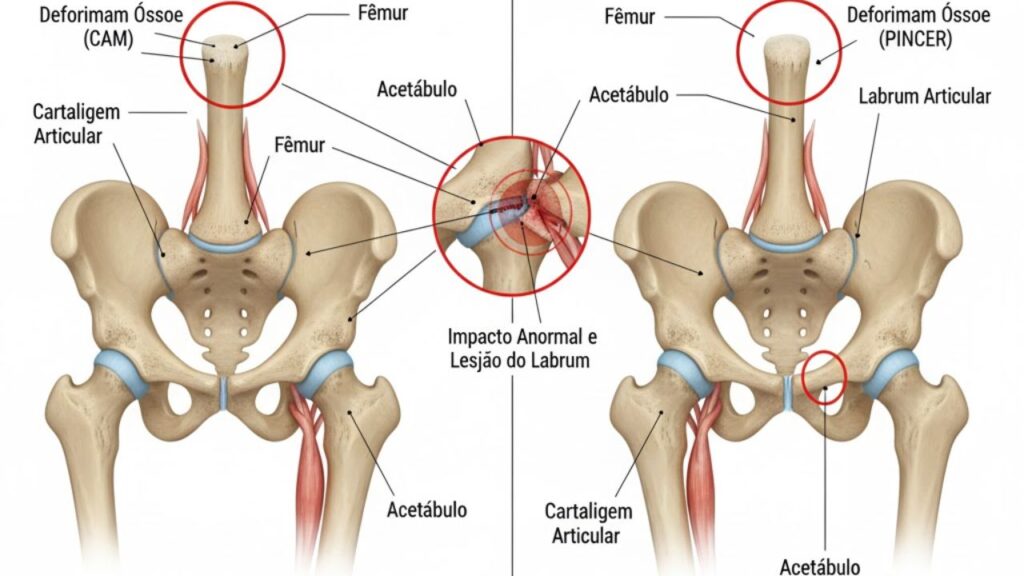 A patologia do Impacto Femoroacetabular é caracterizada por pequenas alterações na forma anatômica dos ossos do quadril. Existem dois tipos principais: o Tipo CAM, onde há uma protuberância óssea na cabeça do fêmur, fazendo com que ela não seja perfeitamente redonda; e o Tipo PINCER, onde há um crescimento excessivo da borda do acetábulo (soquete). Essas deformidades, que podem ocorrer isoladamente ou combinadas, causam o choque mecânico durante o movimento.
