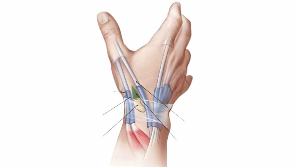Para compreender De Quervain, precisamos focar na anatomia do punho. Os tendões que movem o polegar o abdutor longo do polegar (APL) e o extensor curto do polegar (EPB) passam por um canal estreito na região do punho, chamado de primeiro compartimento extensor. Este canal é revestido por uma bainha sinovial que lubrifica os tendões para um deslizamento suave. No entanto, o De Quervain ocorre quando essa bainha sinovial sofre uma inflamação e inchaço excessivos, estreitando o canal e impedindo que os tendões se movam livremente.
